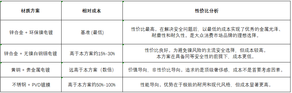 1. 成本極致優(yōu)化: 鋅合金基材與鎳電鍍工藝的組合,是經(jīng)過(guò)市場(chǎng)驗(yàn)證的成本最優(yōu)解之一。