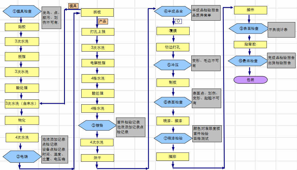 電鑄厚標(biāo)工藝流程為:模具檢查→電鑄→鍍鉻→覆膜→沖壓→表面檢查→噴漆檢驗→背膠→檢查→包裝出貨